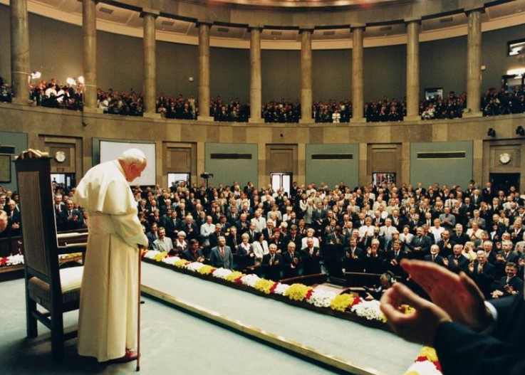 Dlatego w polskim Sejmie, 26 lat temu Jan Paweł II zaznaczył ważną polityczną rolę Kościoła. Przestrzega zarówno przed redukowaniem wizji zjednoczonej Europy wyłącznie do jej aspektów ekonomicznych, politycznych, jak i przed bezkrytycznym stosunkiem do konsumpcyjnego modelu życia. Zdaniem polskiego Papieża nową jedność Europy, jeżeli chcemy, by była ona trwała, winniśmy budować na tych duchowych wartościach, które ją kiedyś kształtowały, z uwzględnieniem bogactwa i różnorodności kultur i tradycji poszczególnych narodów. Ma to być bowiem wielka Europejska Wspólnota Ducha.