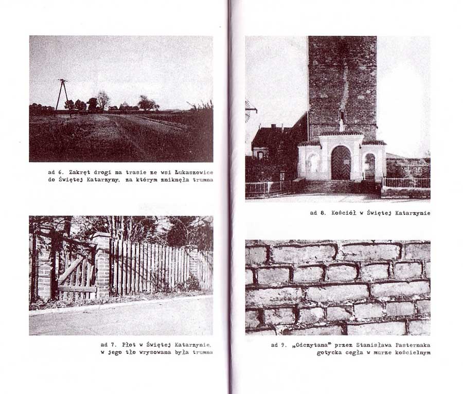 Zacznijmy nie od początku, lecz od końca i nie od samego końca, lecz od strony z dwoma obrazami „ad 6.” i „ad 7.” Są one opatrzone opisami: „ad 6. Zakręt drogi na trasie ze wsi Łukaszowice do Świętej Katarzyny, za którym zniknęła trumna” i „ad 7. Płot w Świętej Katarzynie, w jego tle wrysowana była trumna”. Zaznaczamy jednocześnie, co ważne, że podpisy i opisy pod zdjęciami są w czcionce maszynowej. Również tekst opowieści jest różnicowany przez typografię. Stosuje się tam wersaliki, dla zaakcentowania ważności słowa – myśli (wyróżnienie słowa, fragmentu zdania, całego pojedynczego zdania obok zwykłej minuskuły). W tekście głównym, jeśli tak można tę część wyodrębnić, są podane specyficzne ilustracje, a mianowicie:
