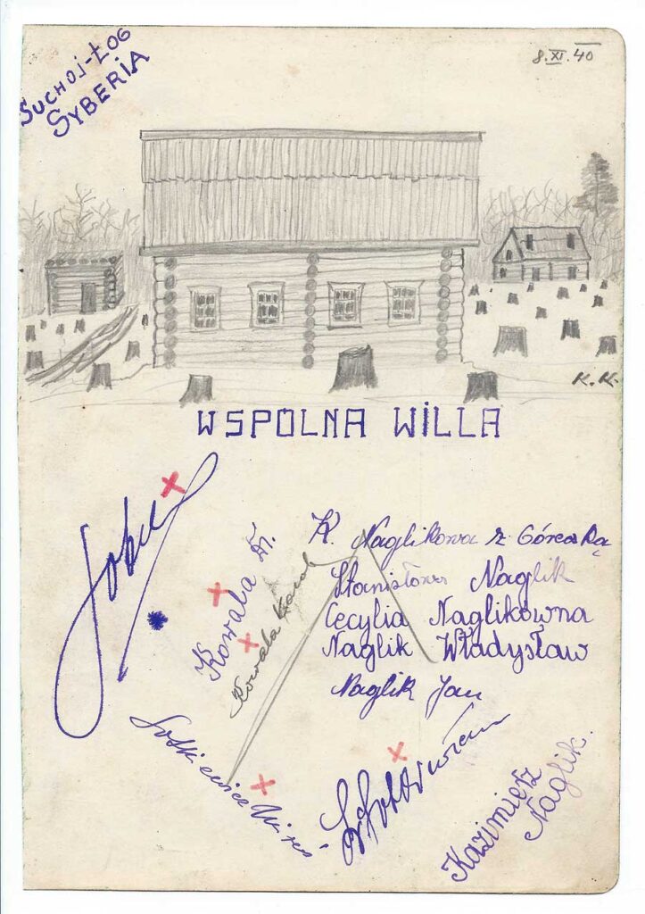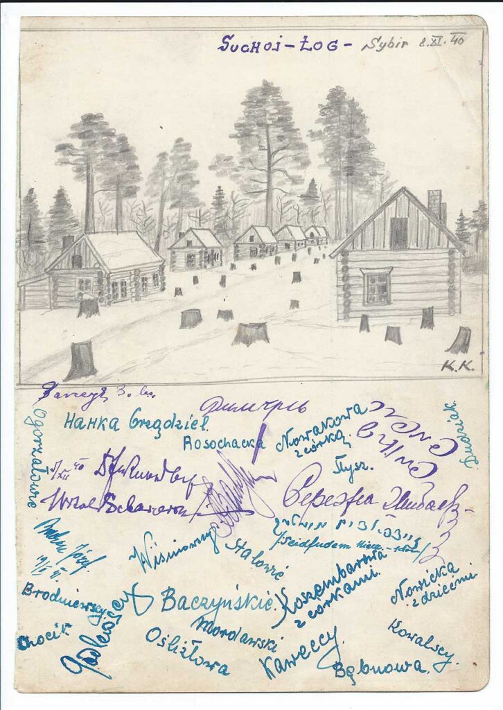 Daty i nazwy miejscowości przy poszczególnych wpisach świadczą o tym, że przed wojną zabierała go na wakacje, że potem towarzyszył jej na zsyłce i w długiej drodze powrotnej do Polski. Na szczególną uwagę zasługują nazwiska zesłańców pod rysunkami osady Suchoj Łog: Ogorzałowa, Hanka Grządziel, Rosochacka, Nowakowa z córką, Słysz, Dudziak, Wiśniowscy, Stalowie, Seidfudem Miecz., Brodniewscy, Baczyńskie, Koszembarowa z córkami, Nowicka z dziećmi, Chocik, Godlewscy, Mordowski, Kaweccy, Bębnowa, Kowalscy. Kilka nazwisk, w tym po rosyjsku, jest nieczytelnych. Pod drugim rysunkiem zatytułowanym „Wspólna willa” widnieją podpisy lokatorów syberyjskiej chaty: Kowala Karol (autor rysunku), Kowala Dł. [Długosława], Sotkiewicz [Wacław], L. Sotkiewiczowa [Lucyna], Sotkiewicz Miruś [Dobromira], oraz K. Naglikowa z córeczką, Stanisława Naglik, Cecylia Naglikówna, Naglik Władysław, Naglik Jan, Kazimierz Naglik.