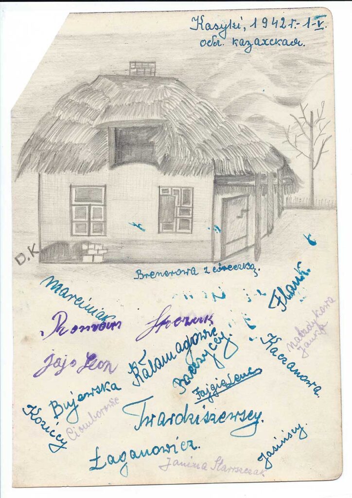 Kolejny rysunek w pamiętniku Długosławy, prawdopodobnie jej autorstwa, z datą 1 V 1942, przedstawia chatę w Kasyku. Podpisali się pod nim: Brenerowa z córeczką, Marciniak, Flank, Roman Stoczuk (?), Nabzdykowa Janka, Jajo Leon, Kałamagowie, Rzeczyccy, Fajgie Lenc, Kaczanowa, Koziccy, Bujewska, Ciomborowie, Twardziszewscy, Łaganowicz, Janina Starszczak, Jasińscy.