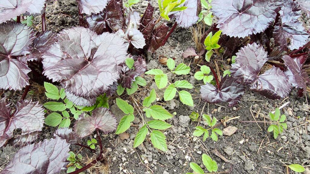 Ekspansywny podagrycznik – jak nazwa wskazuje to lek na podagrę, czyli dnę moczanową – tak wrósł w moją języczkę o pięknych bordowych liściach (pięknych, dopóki ich ślimaki nie zwąchają i nie podziurawią), że zlikwidować go nie sposób. Odrasta nawet z malutkiego kawałka korzenia i zakłóca harmonię rabaty. Właśnie wypuścił świeże listki, które – jak się okazuje – można zerwać, wysuszyć i stosować jako przyprawę. Już w starożytności doceniano jego walory smakowe, a w średniowiecznej Polsce był sprzedawany jako warzywo. Liście i łodygi można dodawać do sałatek, zup, twarogu, może też zastąpić bazylię w pesto.