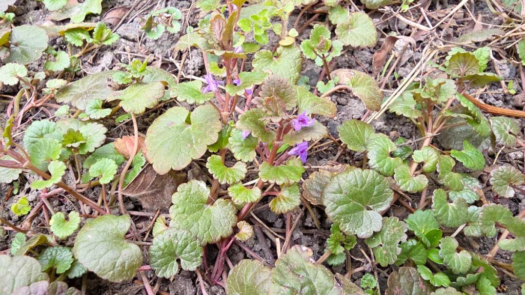 Urokliwy bluszczyk kurdybanek – nazwa od kurdybanów, garbowanych i barwionych skór zdobionych wytłoczonymi motywami roślinnymi – w przeciwieństwie do podagrycznika daje się łatwo wyrywać. Tworzy długie, ulistnione rozłogi, które ciągną się jak niteczki i płytko zakorzeniają. W kwietniu pojawiają się fioletowe drobne kwiatki. Ładna roślinka, niech się płoży, oby nie w nadmiarze. W tym roku zdążyłam już jej sporo powyrywać i teraz trochę żałuję, bo przeczytałam właśnie, że to chwast-cudotwórca, szanowany od starożytności, ceniony przez św. Hildegardę, zalecany przez nią przy bólach głowy.